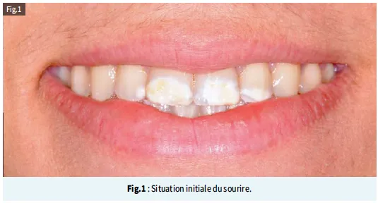Une jeune patiente adulte se présente en consultation en raison d’un sourire dyschromié source de nombreux complexes qu’elle désire corriger.